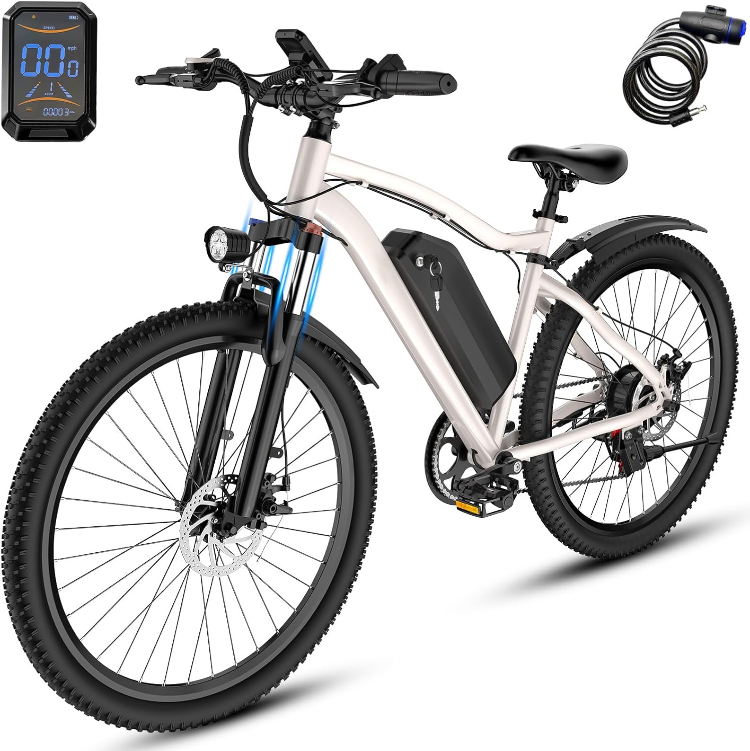 - 🛡️ All-Terrain Stability & Safety Built as a lightweight electric mountain bike, it features 26″x2.1″ anti-slip tires, durable yet portable frame (50.7 lbs), mechanical disc brakes, and reflective tires for superior control, visibility, and safe stopping power.
